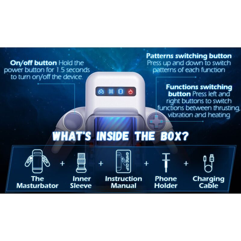 Kissé futurisztikus, gamer vonalra utaló részletekkel, és ügyes megoldásokkal rendelkező kézi maszturbátor, ami a fel-le mozgás mellett, vibrációval és melegítő funkcióval is rendelkezik. Az eszköz fő eleme egy téglatest, aminek oldalából két fogantyú áll ki, a téglatest alsó részén lévő kupakrész levehető, ezután férünk hozzá a hófehér, igen jó minőségű belső járathoz, ami majd az érdemi munkát végzi helyettünk.