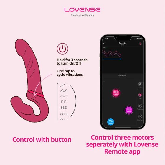 Elérkeztünk az izgalmas részhez. A játékszert Bluetooth kapcsolaton keresztül az ingyenesen leltölthető Lovense Remote app segítségével irányíthatjuk egy vezérlő eszközzel (okostelefon, tablet). A vezérléshez használt eszköz érintőképernyőjén ujjunkat mozgatva tudjuk szabályozni a rezgést, elmenthető egyedi rezgésmintákat hozhatunk létre, de akár azt is beállíthatjuk, hogy a játékszer kedvenc zenéink ritmusára kényeztesse használóit. Az alap app-os vezérlés kiegészíthető azzal, hogy magát a vezérlő eszközt másik készülékkel irányítjuk az interneten keresztül, így gyakorlatilag a világ bármely pontjáról beállíthatjuk és variálhatjuk a vibrációt.